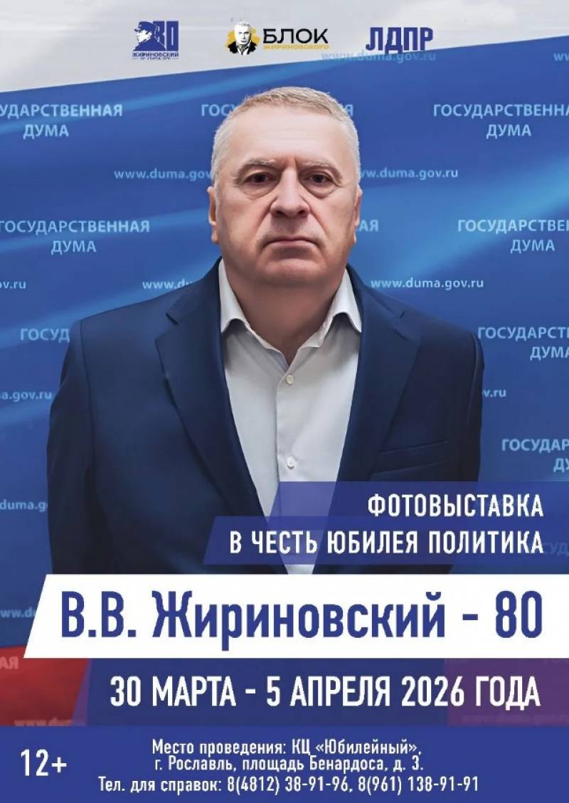 «В.В. Жириновский — 80» в Рославле 25 марта 2026г. | ОргкомитетС 30 марта по 5 апреля 2026 года в Рославле будет работать фотовыставка, посвященная 80-летию со Дня рождения одного из выдающихся политических деятелей современной России Владимира Вольфовича Жириновского. Её открытие состоится в Культурном центре развития и творчества «Юбилейный» 30 марта в 15:00. Экспозиция выставки — не просто хроника, а искренний рассказ о жизни основателя Либерально-демократической партии России. В кадрах — не только государственный деятель, заслуженный юрист России, профессор, но и человек: его улыбка, энергия, неподдельный интерес к людям. Фотовыставка наглядно показывает, как Владимир Вольфович Жириновский, своим личным примером, железной волей и безграничной преданностью идее сплотил вокруг себя единомышленников и, несмотря на все трудности, шел только вперед. График работы фотовыставки: пн-пт с 10:00 до 19:00, сб-вс 10:00 до 18:00. Место проведения: Культурный центр развития и творчества «Юбилейный», г. Рославль, площадь Бенардоса, д. 3 Организатор: Смоленское региональное отделение ЛДПР. Телефоны для справок: 8(4812)38-91-96, 8(961)138-91-91. Возрастные ограничения: 12+ Вход свободный для всех желающих.