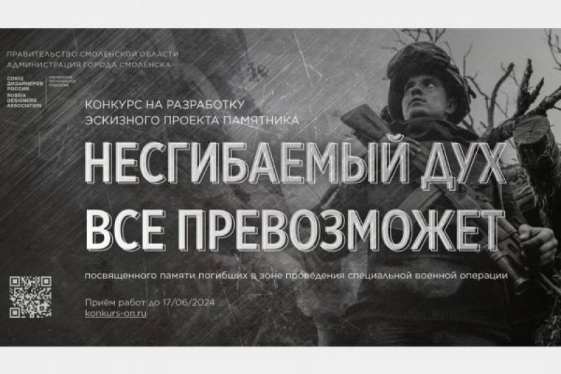 В Смоленске возведут мемориал в память о защитниках, погибших в зоне специальной военной операции. Об этом сообщили на официальном сайте Администрации города Смоленска. Мемориал будет носить название «Несгибаемый дух всё превозможет». Эта фраза нанесена на герб Смоленской области. Смоляне много веков героически защищали Отечество, отстаивали интересы нашего государства и спасали весь мир от фашизма. Сейчас военнослужащие в зоне спецоперации проявляют силу духа, самоотверженность и отвагу, сражаясь с неонацизмом. Мемориал станет символом памяти о погибших бойцах, их мужества, доблести и верности долгу. Принять участие в разработке эскиза памятника для мемориала могут все желающие. Лучший проект выберут эксперты по итогам конкурса, организованного Правительством Смоленской области, Администрацией города и Союзом дизайнеров России. Скульптура должна быть выполнена в вертикальной композиции и может состоять из нескольких человеческих фигур – не более трёх, памятник будет создан из долговечных материалов (мрамора, гранита, чугуна, бронзы, других видов камня и металла или их сочетаний). Организаторы конкурса эскизов памятника отмечают, что в качестве проекта можно представить трехмерные модели, фотографии макетов или графические эскизы, выполненные в любой технике. Приём заявок продлится до 17 июня, принять участие в конкурсе можно по ссылке. Планируется, что мемориал установят возле музея «Смоленщина в годы Великой Отечественной войны 1941 – 1945 гг.».