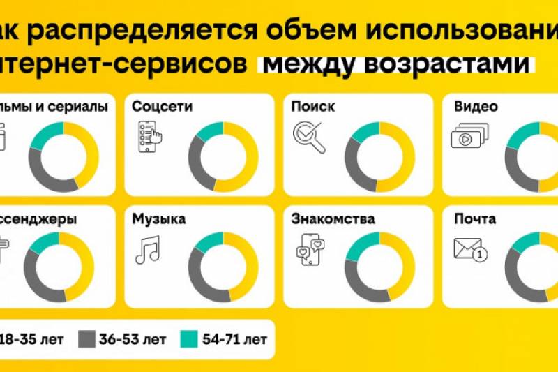 Молодежь активно использует интернет-сервисы, такие как прослушивание музыки, использование электронной почты и просмотр видео онлайн. Однако, по воскресеньям молодежь использует интернет меньше, чем пользователи других возрастных групп. Сервис билайн.аналитика провел исследование, которое показало, что молодежь использует на 30% больше трафика, чем люди среднего возраста, и в два раза больше, чем абоненты старшего возраста. Фильмы и сериалы являются абсолютным лидером по использованию трафика, на них приходится около половины суммарного трафика, используемого на все типы сервисов. Социальные сети занимают второе место по объему трафика, а поисковые системы и просмотр видео занимают третью строчку. Меньше всего трафика уходит на прослушивание музыки, переписку в почте и использование сервисов для знакомств. Самым активным днем с точки зрения использования трафика для абонентов всех возрастов стала пятница. Что касается использования конкретных сервисов по дням, то молодежь предпочитает смотреть фильмы по пятницам и четвергам, люди среднего возраста – по пятницам и воскресеньям, а пользователи старшего возраста – больше в воскресенье, чем в пятницу.