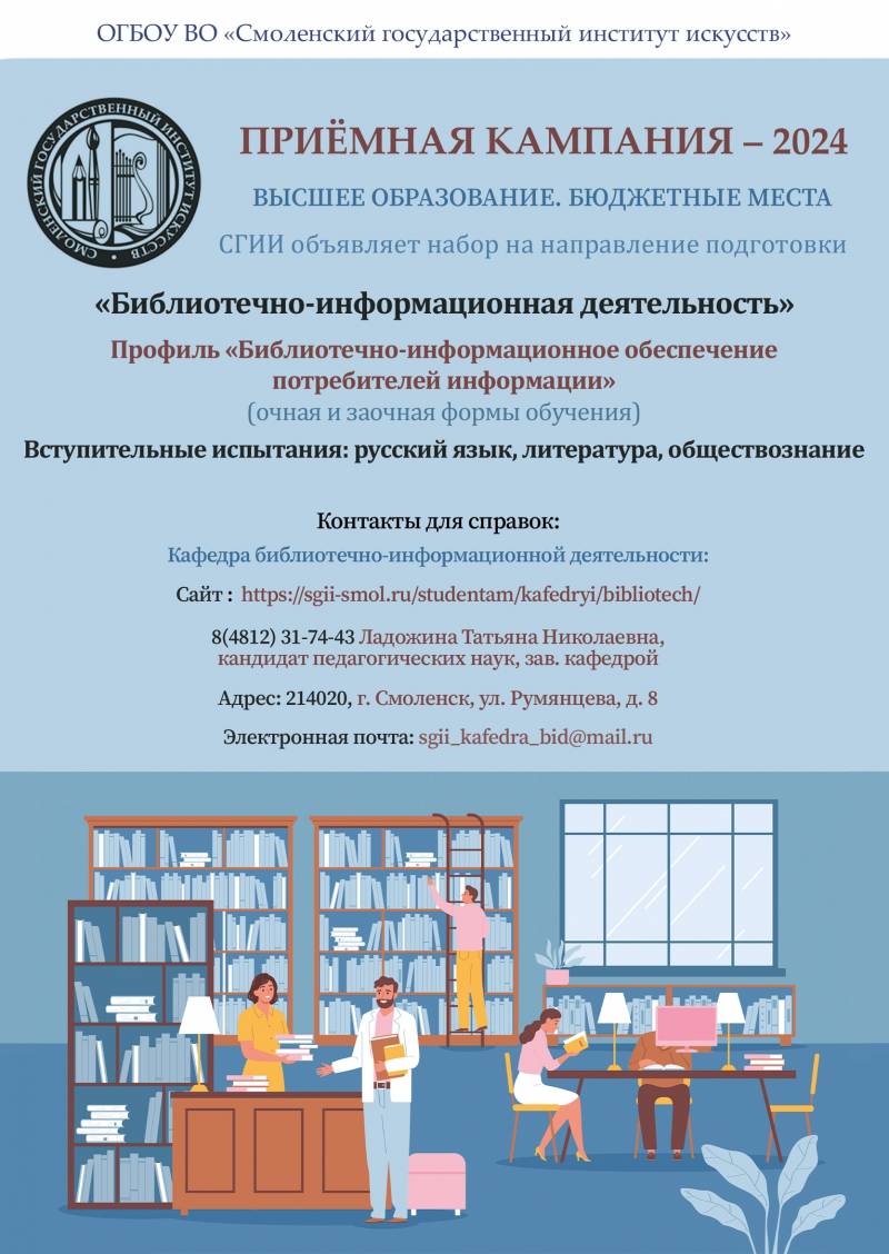 Смоленский государственный институт искусств приглашает учащихся старших классов школ Рославльского района принять участие в Дне открытых дверей, который состоится 23 марта 2024 г. в 11-00 часов. Подробная информация о мероприятии доступна на официальном сайте СГИИ и в официальной группе ВКонтакте. Ссылка на презентацию вуза также доступна на сайте. Справки по телефону: (4812) 31-00-66 - приёмная комиссия СГИИ.