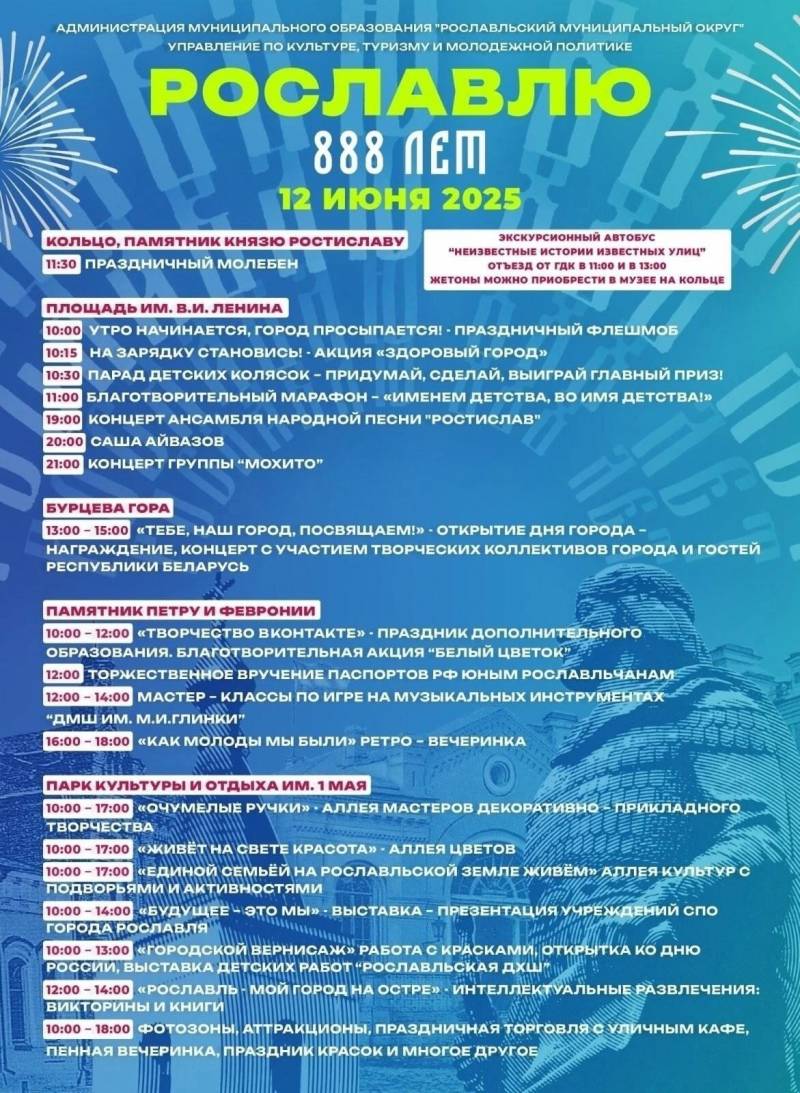 Далее, на территории памятника Петру и Февронии, с 10:00 до 12:00 пройдет праздник дополнительного образования под названием "Творчество в контакте". Также здесь состоится благотворительная акция "Белый цветок". В 12:00 пройдет торжественное вручение паспортов Российской Федерации юным рославльчанам. С 12:00 до 14:00 будут организованы мастер-классы по игре на музыкальных инструментах детской музыкальной школы имени М.И. Глинки. Завершит этот блок ретро-вечеринка "Как молоды мы были", которая пройдет с 16:00 до 18:00.