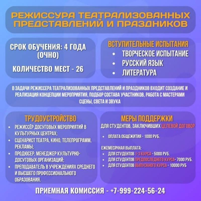 Среди множества специальностей, представленных здесь, особое внимание заслуживает профессия режиссера театрализованных представлений и праздников. Что же привлекает студентов в этом направлении?