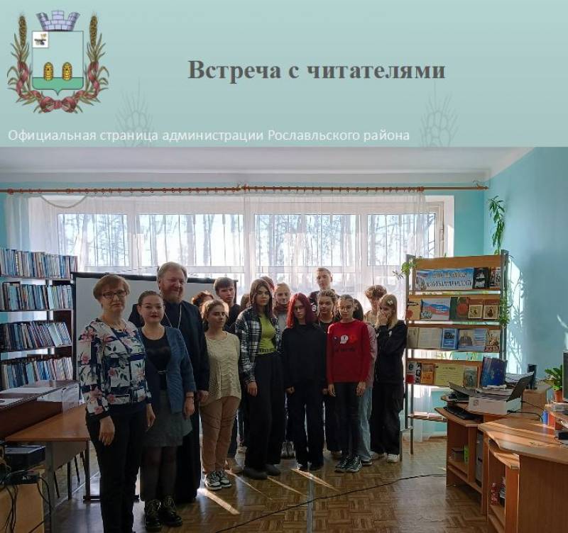 Встреча с читателями 3 ноября 2023г. | наш корреспондент3 ноября в преддверии Дня народного единства на юношеском секторе центральной библиотеки им. Н. И. Рыленкова для студентов I курса Рославльского многопрофильного колледжа проведен документальный хронограф «Единения тернистый путь». Присутствующие получили много полезной информации об истории праздника, Смутном времени, освобождении Москвы от польских интервентов, о роли Минина и Пожарского в объединении страны. На протяжении всей встречи ее участники слушали тематические стихи, смотрели медиапрезентацию «Герои смутного времени» с фрагментами документальных и художественных исторических видеофильмов, знакомились с литературой на книжно-иллюстративной выставке «Единство народа – несокрушимая крепость». Почетным гостем мероприятия стал настоятель храма в честь Рождества Пресвятой Богородицы г. Рославля протоиерей Михаил Гольцман. В своем выступлении он отметил, что День народного единства неразрывно связан с Казанской иконой Божией Матери, а также рассказал о чудотворном явлении её образа людям. В заключении отец Михаил призвал молодежь помнить о самых простых проявлениях христианского единства — поддерживать друг друга словом и делом, никого не обижать и самим не обижаться.