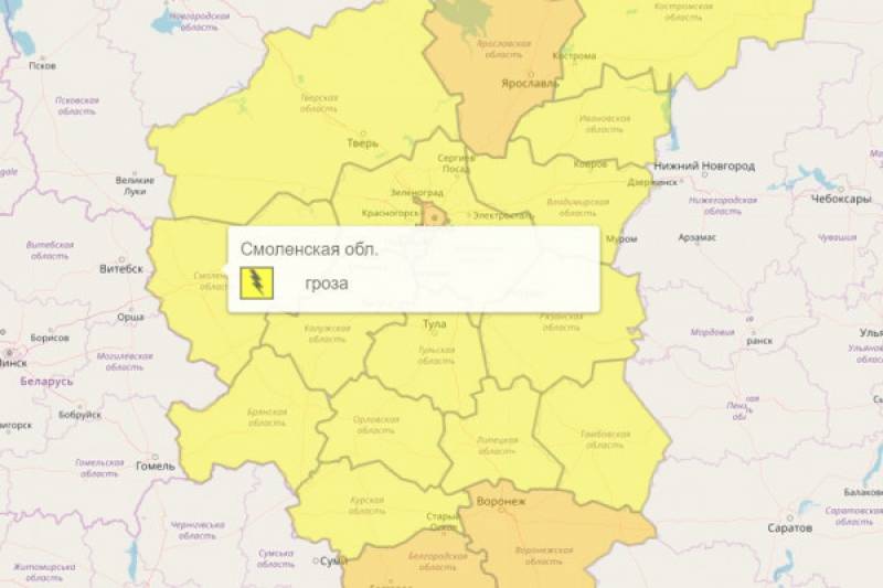 "В Смоленском регионе объявлен «жёлтый» уровень опасности из-за грозы"