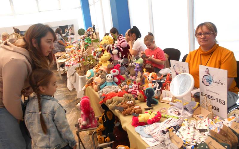 В Вяземском культурно-выставочном центре состоялась традиционная «Осенняя ярмарка мастеров». Как всегда, мероприятие порадовало разнообразием поделок народных умельцев и радужными красками ярмарочных рядов. Осенняя ярмарка мастеров народного прикладного творчества – это всегда яркий праздник. Свою рукодельную продукцию представили народные умельцы Вязьмы и Вяземского района. В начале торжественного открытия ярмарки участникам мероприятия просмотрели видеофильм о ярмарках вяземских мастеров декоративно-прикладного творчества предыдущих лет. Организатором и вдохновителем таких ярмарок является народная умелица Марина Гибовская. Её бурночествовали приглашённые на сцену мастера – 15 человек, которые преподнесли, со словами благодарности, термос, так необходимый Марине как любительнице кофе. Открытие ярмарки сопровождалось стихами об осени, песнями и танцами. Перед посетителями и мастерами выступила певица Алина Тихомирова, сольный танец с элементами акробатики представила Анна Барановская, танцевальную экспрессивную картину подарили юные артисты Образцового хореографического коллектива «Антре». Публика, большую часть которой составили дети, дружно отвечала на загадки об осени и предметах рукоделия. Детвора с удовольствием приняла предложение подвигаться под ритмичную музыку. На ярмарке представил свою оздоровительную продукцию гость из Угранского района Владимир Воронков, предлагающий вязьмичам оригинальные снадобья для укрепления здоровья: пасты из семечек, орехов, семян тыквы, травные сборы, варенье из сосновых шишек… В течение всего дня на ярмарке можно было приобрести эксклюзивную продукцию: сувениры из различных материалов, мыло, свечи, бижутерию, мягкие игрушки, глиняные изделия, цветочные композиционные букеты, вязаные и вышитые вещи… Все предметы дороги тем, что сделаны с добром и любовью теплом человеческих рук.